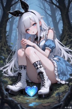 She has black and white checkered knee-high socks and white boots with black laces