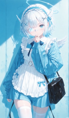 1girl,bandaid on face,white hair,bandaid,hair ornament,frills,wing hair ornament,jacket,eyepatch,hairband,short hair,blue eyes,glint,frilled hairband,long sleeves,hairclip,thighhighs,bandaid on nose,blue nails,looking at viewer,blue theme,sleeves past wrists,bag,,, masterpiece,best quality,highly detailed,extremely detailed, CG,