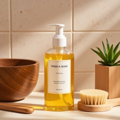 ttmzhsas, a bathroom setting with a bottle of liquid soap, a wooden bowl, and a wooden brush. The bottle has a white pump dispenser and a white label with the text "SHAN A SHAN" in black font. The background is a beige tiled wall with a small potted plant on the right side. The lighting is soft and natural, casting gentle shadows. The wooden bowl and brush are placed on the left side of the image. The overall aesthetic is minimalistic and clean.<lora:S-T-电商场景-S1.4:1>
