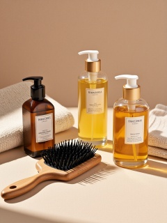 ttmzhsas, a wooden hairbrush, a bottle of body lotion, and a glass bottle of lotion on a beige surface. The bottle is brown with a white label and a gold cap, and the bottle is filled with a golden liquid. The wooden brush has black bristles and a wooden handle. The background is a neutral beige fabric with a subtle texture. The lighting is soft and natural, casting gentle shadows. The image is high quality and has a minimalistic aesthetic.<lora:S-T-电商场景-S1.4:1>