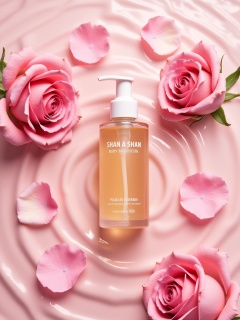 ttmzhsas,a bottle of "SHAN A SHAN" body lotion with a pump, surrounded by pink roses and rose petals on a pink, rippled surface. The bottle is placed in the center of the image, with the pink roses on either side. The liquid inside the bottle is a light pink color, and the roses are a vibrant pink. The background is a soft, pastel pink color. The image has a dreamy, ethereal quality.<lora:S-T-电商场景-S1.4:1>