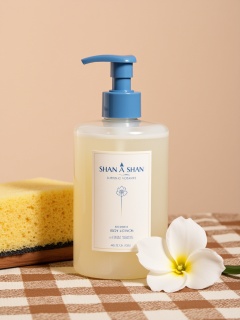 ttmzhsas,a bottle of "SHAN A SHAN" body lotion with a blue pump, placed on a brown and white checkered tablecloth, accompanied by a sponge and a white flower. The bottle has a white label with the brand name "SHAN A SHAN" written in a cursive font. The background is a neutral beige color. The image has a soft, dreamy quality.<lora:S-T-电商场景-S1.4:1>