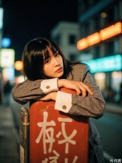 35mm film photography style, capturing an urban night scene. A woman with straight black hair (blunt bangs, shoulder - length) leans over a graffiti - covered red street sign, arms crossed on top of the sign, head resting sideways on her arms. She wears a black - and - white checkered blazer with white cuffs and gold buttons. The background features blurred city buildings and glowing neon strips (orange and teal hues). Lighting: warm orange side - light illuminates her face and shoulder, with cool blue ambient light creating contrast. Composition: low - angle mid - shot to emphasize the interaction between her and the sign, with bokeh from neon lights in the background. Include 35mm film grain, vintage color cast (warm oranges and cool teals), and soft highlight roll - off. Focus on textures: the checkered pattern of the blazer, the worn graffiti on the sign, and the natural skin texture with subtle shadows under her eyes for a slightly languid expression.jp