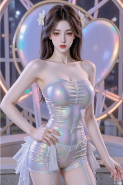 The image is a 3D rendering of a young woman posing in a futuristic outfit She is standing on a stage with a rainbow-colored background The woman is wearing a strapless, metallic bodysuit with a sweetheart neckline and a ruffled skirt that falls below her knees The bodysuits are covered in a shiny, iridescent material that reflects the light and creates a rainbow effect She has long dark hair styled in loose waves and a small flower in her hair The overall aesthetic of the image is futuristic and edgy., yyzs, sw,mn,fgxp,xz,