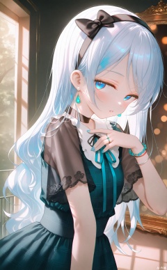 1girl, jewelry, solo, earrings, long_hair, blue_eyes, window, neck_ribbon, hairband, swept_bangs, fingernails, railing, bracelet, light_particles, upper_body, blurry, wavy_hair, black_hairband, backlighting, parted_lips, indoors, lace_trim, short_sleeves, blurry_background, ribbon, blue_nails, pearl_earrings, looking_at_viewer, dot_nose, bokeh, light_blue_hair, frilled_sleeves, lace-trimmed_sleeves, official_alternate_hairstyle, lace, depth_of_field, plaid, dress, tsurime, frills, hand_up, sunlight, day, nail_polish, mirror, lens_flare, half_updo, small_breasts, tree, blue_hair, reflection, choker, plaid_dress, yoisaki_kanade, white_hair, balcony, ring, bloom, straight_hair, breasts, hand_on_own_chest, arm_at_side, eyelashes, drop_earrings, hair_behind_ear, wide_sleeves, grey_ribbon, blue_ribbon, sideways_glance, black_headband, beads, sidelighting, hair_down, black_ribbon, official_alternate_hair_length, green_dress, long_fingernails, lace-trimmed_dress