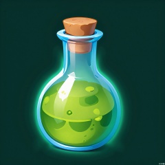 TBDJ, A lively, digital illustration of a glowing, green potion bottle with bubbling liquid inside. The bottle has a cork stopper and a label with strange symbols. The background is a simple, dark green.