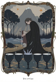 OKLP, A digital illustration of a "Five of Cups" - inspired tarot scene, showing a figure in black robes standing in front of three overturned cups. Two upright cups are in the background. They are enclosed in an ornate frame with mournful and reflective patterns. The figure's head is bowed in sorrow. The cups are made of black ceramic. The background is filled with a tarot - like pattern of dark trees, a river, and a gray sky. The artwork has a detailed, semi - realistic style with muted, dark colors and soft shading, representing loss and regret.