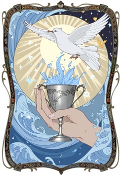 OKLP, A digital illustration of a "Ace of Cups" - inspired tarot scene, showing a hand holding a cup overflowing with water. A dove flies above the cup. They are enclosed in an ornate frame with water - related and spiritual patterns. The cup is made of silver with intricate carvings. The hand is elegant and well - manicured. The background is filled with a tarot - like pattern of waves, hearts, and light rays. The artwork has a detailed, semi - realistic style with soft, blue - toned colors and gentle shading, representing emotional abundance and new beginnings.