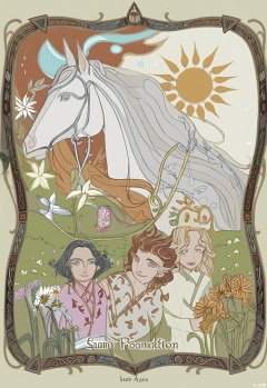 OKLP, A digital illustration of a "Sun" - themed tarot card art, featuring a child riding a white horse in a sunny meadow. Flowers bloom all around. They are surrounded by a frame with solar and floral patterns. The child has a bright smile and is wearing a simple, white tunic. The horse has a golden mane and tail. The background is a tapestry of tarot - style patterns of sunbeams, daisies, and butterflies. The artwork is done in a detailed, semi - realistic style with warm, vibrant colors and bright shading, symbolizing joy and vitality.
