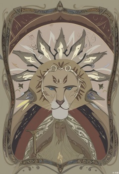 OKLP, A digital illustration of a "Strength" - inspired tarot card scene, showing a powerful female warrior with a lion at her feet. She is embracing the lion in a gentle yet commanding way. They are surrounded by a decorative frame with geometric and animal - themed patterns. The warrior is clad in a leather armor with gold accents and a red cape. The lion has a magnificent mane. The background is filled with a complex tarot - like pattern of overlapping circles and tribal symbols. The artwork has a detailed, semi - realistic style with bold shading and warm, earthy colors, conveying a sense of inner and outer strength.