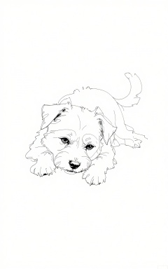 GBSX, Digital pen sketch of a dog with a fluffy, white coat and floppy ears. It's lying on its side, one paw raised slightly. The minimalistic lines outline its round body and friendly face, with the texture of its fur suggested by light, quick strokes. The dog's eyes are warm and welcoming as it gazes at the viewer against the white background.