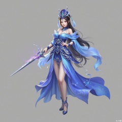 An Oriental female character in blue costume. She stood on her side holding a long sword, which glowed blue-purple and looked very powerful. Her dress was flowy and ornate, and she wore a hat adorned with tassels and jewels. The whole picture is dominated by a grey background, highlighting the presence of the characters