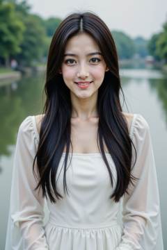 film grain, 1girl, solo, realistic, black hair, looking at viewer, dress, long hair, smile, white dress, brown eyes, photorealistic, upper body, river,