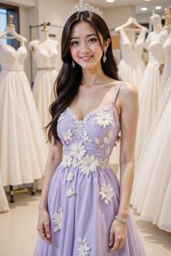 The image shows a woman wearing a lavender dress adorned with white floral embellishments. The dress has thin straps and a fitted bodice. She is standing in what appears to be a bridal shop, as there are several white wedding dresses hanging in the background. The woman has long, dark hair styled in an elegant updo, and she is wearing a tiara. She is also wearing earrings and a bracelet. The setting is bright and well-lit, with a soft, serene ambiance.