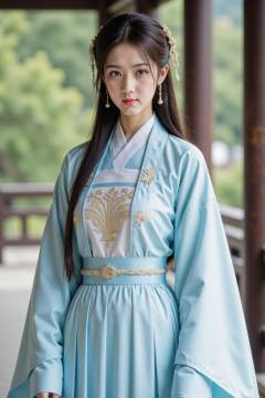 The image depicts a person dressed in traditional East Asian attire, specifically a hanfu. The outfit is light blue with intricate gold embroidery on the chest area, and the person is wearing a matching light blue outer garment. The individual has long, dark hair styled with delicate hairpins and earrings. The background features a wooden structure with vertical columns and a railing, suggesting an outdoor setting with greenery visible in the distance. The overall scene has a serene and traditional aesthetic.