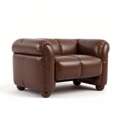 PZF, A high - quality photograph of a chocolate - brown inflatable bench with a cozy design. The bench has an inflated, long seat and backrest, with short, sturdy legs. The surface is a soft, plush - like material that gives it a warm and inviting look. The material is a matte, yet slightly reflective fabric that catches the light. The bench is positioned against a plain white background, making its chocolate - brown color prominent. The style is modern and comfortable, with a slight vintage feel in its rounded form.