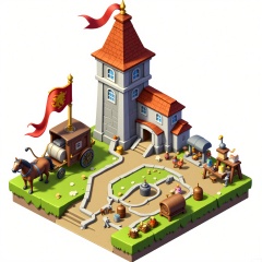 DJJZ, A colorful, detailed isometric illustration of a medieval - themed game building. The main castle is made of gray stone with red - tiled roofs and tall, pointed towers. A large, red - and - gold banner with a lion emblem flutters on the highest tower. On a white background, the ground is like a grassy meadow. To the left, a brown and white horse - drawn carriage ride with a circular route is in motion. The foreground has a village square with peasants, blacksmith tools, and barrels of ale. There are also swords and shields placed here and there. The style is whimsical and historical.