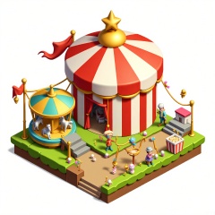 DJJZ, A colorful, detailed isometric illustration of a circus - themed game building. The central big - top is a red and white striped tent with a large, golden star on top. The white background represents the open sky. To the left, a green and yellow carousel ride with prancing horses is spinning. The foreground has a performance area with clowns, juggling balls, and trapezes. There are also popcorn boxes and cotton - candy sticks scattered around. The overall style is whimsical and lively.