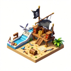 DJJZ, A colorful, detailed isometric illustration of a pirate - themed game building. The main ship is a black and red wooden galleon with tattered sails and a large, skull - and - crossbones flag. A treasure chest full of gold coins and jewels is on the deck. On a white background, the ground is like a sandy beach. To the left, a blue and white rowboat ride with a short, back - and - forth track is available. The foreground has a pirate camp with cutlasses, pistols, and maps. There are also parrots and seagulls flying around. The style is whimsical and adventurous.