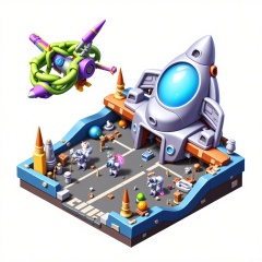 DJJZ, A colorful, detailed isometric illustration of a space - themed game building. The central structure is a silver and neon - blue spaceship - shaped building with a large, pulsating energy core at the front. The white background represents the vastness of space. To the left, a green and purple asteroid - coaster ride with a wild, looping track is flying. The foreground has a launch pad with small rockets, astronaut suits, and alien artifacts. There are also floating energy orbs and laser guns scattered around. The overall style is whimsical and futuristic.