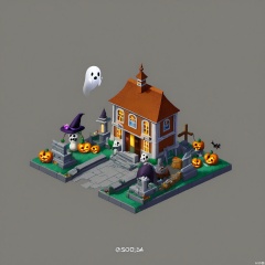 DJJZ, A colorful, detailed isometric illustration of a haunted - house - themed game building. The main mansion is a dilapidated, gray - stone structure with broken windows, a crooked roof, and a large, full - moon - shaped window. Ghosts are floating around the building. On a white background, the ground is covered in fog. To the left, a black - and - white ghost - train ride with a spooky, winding track is in operation. The foreground has a graveyard with tombstones, skeletons, and jack - o' - lanterns. There are also witch hats and brooms scattered around. The overall style is whimsical and eerie.