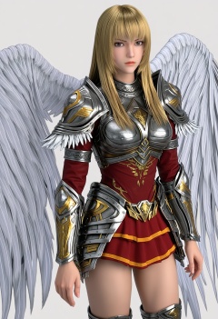score_9,high detail,best quality,shiny skin,shiny,tianshiyan,1girl,solo,brown eyes,blonde hair,long hair,armor,shoulder armor,closed mouth,lips,angel wings,white background,breastplate,realistic,skirt,boots,simple background,looking at viewer,thighs,<lora:QQSponytianshiyanV1:0.8>,<lora:Pony_DetailV2.0:0.8>,<lora:皮肤凹痕:0.1>,