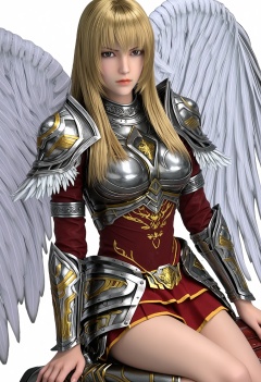 score_9,high detail,best quality,shiny skin,shiny,tianshiyan,1girl,solo,brown eyes,blonde hair,long hair,armor,shoulder armor,closed mouth,lips,angel wings,white background,breastplate,realistic,skirt,boots,simple background,looking at viewer,thighs,<lora:QQSponytianshiyanV1:0.8>,<lora:Pony_DetailV2.0:0.8>,<lora:皮肤凹痕:0.1>,