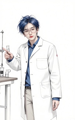 SHF, Hand - drawn portrait of a young man with spiky blue hair, wearing a white lab coat and safety goggles. He is standing in a laboratory, one hand holding a test tube and the other pointing at some equipment, looking at the viewer with an inquisitive and intelligent expression. The simple white background highlights his scientific and curious nature.