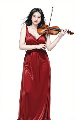 SHF, Paper - drawn depiction of a female musician with long, wavy black hair, wearing a red velvet dress and holding a violin. She is in a playing stance, one hand on the bow and the other on the violin's strings, looking at the camera with a soulful and dedicated expression. The white background showcases her musical talent and elegance.