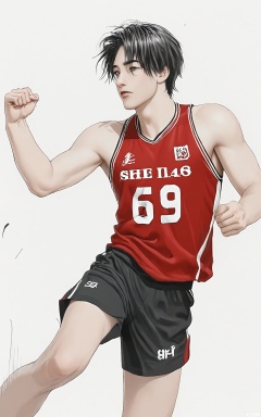 SHF, Hand - drawn illustration of a male athlete with short, dark hair, wearing a red sports jersey and black shorts. He is in a running stance, one leg forward and arms pumping, looking ahead with a determined expression. The simple white background emphasizes his energetic and competitive nature.