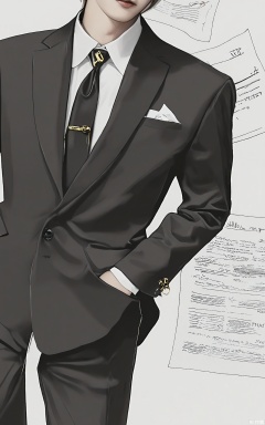 SHF, Hand - drawn illustration on paper of a young man with short, spiky brown hair, wearing a black suit and a gold tie clip. He is standing with one hand in his pocket and the other gesturing slightly, looking off to the side with a thoughtful expression. Simple white background, with a focus on his sophisticated and contemplative aura.