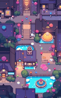 Aerial view of a candy - land pixel - art village at night, with a bright and sugary color palette. The scene is packed with pixel - made gingerbread houses, lollipop trees, and chocolate fountains. The village is illuminated by a soft, candy - like glow, generating a sweet and playful ambiance. The buildings are made of candy and frosting, with some decorated with sprinkles and candies. The streets are paths of marshmallows and gummy bears, with small candy shops and stalls glowing with various colors. The overall aesthetic is whimsical and delicious, with a focus on symmetry and balance.