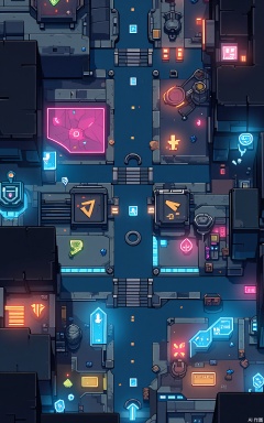 Aerial view of a space - station pixel - art complex at night, with a futuristic and colorful palette. The scene is brimming with pixel - constructed modules, spaceships, and holographic displays. The complex is lit by a bright, neon - like glow, generating a high - tech and energetic ambiance. The buildings have smooth, metallic surfaces and glowing energy panels, some featuring geometric designs. The streets are corridors with moving platforms and robotic workers, their lights adding to the dazzling display. The overall aesthetic is sleek and futuristic, with a focus on symmetry and balance.