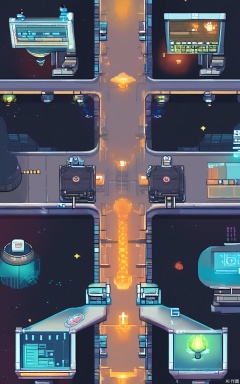XSCJ, Aerial view of a space - station pixel - art complex at night, with a futuristic and colorful palette. The scene is brimming with pixel - constructed modules, spaceships, and holographic displays. The complex is lit by a bright, neon - like glow, generating a high - tech and energetic ambiance. The buildings have smooth, metallic surfaces and glowing energy panels, some featuring geometric designs. The streets are corridors with moving platforms and robotic workers, their lights adding to the dazzling display. The overall aesthetic is sleek and futuristic, with a focus on symmetry and balance.