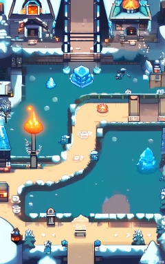 XSCJ, Aerial view of a winter - wonderland pixel - art village at night, with a cool, blue - and - white color palette. The scene is brimming with pixel - made igloos, snow - covered cabins, and ice sculptures. The village is illuminated by the glow of the aurora borealis and lanterns, generating a magical and frosty ambiance. The buildings are made of ice and snow, with some decorated with icicles and lights. The streets are paths of snow and ice, with small winter - themed shops and stalls glowing with various colors. The overall aesthetic is enchanting and cold, with a focus on symmetry and balance.