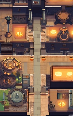 XSCJ, Aerial view of a steampunk pixel - art industrial town at night, with a warm, copper - and - brass color scheme. The scene is filled with pixel - constructed factories, steam - powered machines, and airships. The town is bathed in a soft, golden glow from the factory chimneys and street lamps, creating a cozy and industrious atmosphere. The buildings have large gears and pipes on the exterior, with some featuring ornate metalwork. The streets are lined with workshops and supply stores, their signs glowing with a warm light. The overall aesthetic is robust and mechanical, with a focus on symmetry and balance.