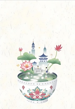 A whimsical, surreal illustration of a Chinese porcelain vase, decorated with intricate, colorful lotus patterns in shades of white, pink, and green. Inside the vase, there's a miniature Chinese garden with a small bridge, a koi pond, and a figure sitting on a bench. In the background, stylized mist - covered mountains and traditional Chinese towers rise, evoking a serene, dreamlike landscape. The image is soft and delicate, with a pastel color palette and a dreamy, ethereal quality.