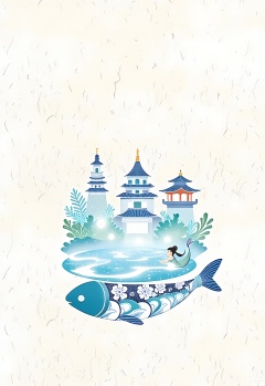 A whimsical, surreal illustration of a Chinese soap dish, shaped like a Chinese fish and decorated with colorful wave patterns in shades of blue, white, and silver. Inside the dish, there's a small, floating Chinese mermaid figure. In the background, stylized underwater palaces and coral reefs create a serene, dreamlike landscape. The image is soft and delicate, with a pastel color palette and a dreamy, ethereal quality.