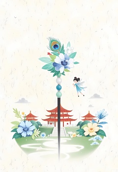 A whimsical, surreal illustration of a Chinese hairpin, decorated with colorful peacock feathers and jade beads in shades of blue, green, and white. On the hairpin, there's a small, floating Chinese fairy figure. In the background, stylized flower gardens and ancient Chinese pavilions are bathed in a soft light, evoking a serene, dreamlike landscape. The image is soft and delicate, with a pastel color palette and a dreamy, ethereal quality.