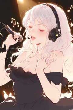 1girl, enjoying, elegant headphones, microphone, singing, studio, musical notes, closed eyes, peaceful, singing, concentration, portrait, expressive eyes, dynamic pose, beautiful, expressive face, one hand holding headset, the other hand holding microphone, frilled dress, black dress, exposed shoulders, parted breast, standing on the stage, under spotlight,art_sket,