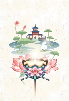 A whimsical, surreal illustration of a Chinese candle holder, shaped like a Chinese lotus lantern and decorated with colorful floral patterns in shades of pink, purple, and green. Inside the holder, there's a small, floating Chinese spirit figure. In the background, stylized ancient Chinese gardens and ponds with lotus flowers create a serene, dreamlike atmosphere. The image is soft and delicate, with a pastel color palette and a dreamy, ethereal quality.