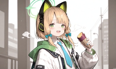 line-drawing-style,monochrome,full shot, greyscale,(best quality),(masterpiece),1girl, midori \(blue archive\), blue archive, aiamu iamu, holding food, holding, hooded jacket, food, sidelocks, :d, collared shirt, blurry, long sleeves, puffy sleeves, headphones, blue bow, hand up, necktie, upper body, halo, looking at viewer, jacket, sleeves past wrists, blush, nail polish, blue necktie, animal ear headphones, blurry background, blonde hair, shirt, green eyes, hood down, open clothes, depth of field, hood, smile, white jacket, fake animal ears, bow, puffy long sleeves, open jacket, solo, dress shirt, animal ears, white shirt, blue nails, hair bow, long hair, drawstring, sweet potato,