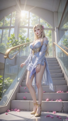 This picture depicts a lady standing on a staircase. She has long blond hair, wearing an elegant blue dress with a golden embellishment, and a floral accessory on her hair. The staircase is made of concrete with glass handrails leading to a large window through which natural light illuminates the entire space. Pink flowers scattered under her feet, the background shows a modern and light-filled indoor environment, with green plants outside visible through large windows.