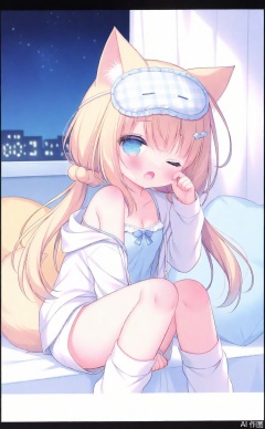 loli,loli,loli,loli,loli,loli,loli,loli, dim1_dim1-7a1fbda9, 1girl, animal_ears, sleep_mask, solo, jacket, camisole, one_eye_closed, breasts, short_shorts, animal_ear_fluff, long_hair, sleeves_past_wrists, window, hood, long_sleeves, night, hood_down, open_jacket, blue_eyes, hooded_jacket, open_clothes, shorts, indoors, socks, pillow, between_legs, mask_on_head, strap_slip, hand_between_legs, sitting, night_sky, cleavage, sky, bow, open_mouth, blush, clock, low_twintails, feet_out_of_frame, blue_bow, twintails, starry_sky, off_shoulder, looking_at_viewer, star_(sky), small_breasts, white_shorts, very_long_hair, alarm_clock, curtains, hair_ornament, frills, loose_socks, ;o, fang, tail, knees_up, mask, frilled_pillow, bare_shoulders, digital_clock, waking_up, white_camisole, hand_up, puffy_long_sleeves