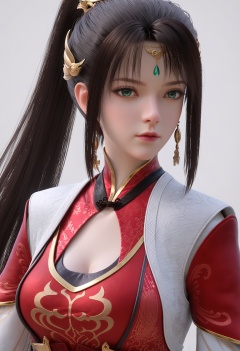 score_9,high detail,best quality,cinematic lighting,volumetric lighting,shiny skin,shiny,nanmingyushu,1girl,solo,green eyes,black hair,hair ornament,white background,jewelry,long hair,dress,simple background,ponytail,closed mouth,red dress,realistic,earrings,chinese clothes,clothing cutout,cleavage cutout,forehead jewel,breasts,expressionless,looking at viewer,upper body,<lora:Pony_DetailV2.0:0.8>,<lora:皮肤凹痕:0.1>,<lora:QQSponynanmingyushuV1:0.8>,