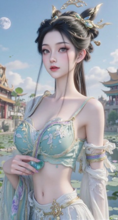 (masterpiece:1.2),best quality, (UE5.5,rendered with Unreal Engine 5,Unreal Engine 5,CG rendering),1girl, navel, solo, midriff, bare shoulders, hair ornament,(long hair),(High double ponytail:1.49), red lips, BREAK, (looking at viewer:1.39), chinese clothes,(long dress:1.36), (lace:1.28), BREAK,blurry, solo focus, long hair, lips, daytime, lipstick, outdoors, standing,upper body,(huge breasts:2.99), (full breasts:2.99),background, solo, makeup,Xyunxiao,(Lotus,Water Lily,Blue sky,full moon:1.39),(Lotus pond,ancient Chinese architecture:1.39),Xmupeiling,XsongyuYK,XqiyueFHK,XheguangzhefandiYK,XxiaobaiNZYK,XlimuwanJCBYK,XmeijiK,XzhouruK,XHhanfududou,XzhouruK2,XmeijiK2,XlinziyueK2,Xjinniang2,Xdunhuangfeitian,Xyinggou2,XnangongxierK2,Xnvwashenian2,XmupeilingYK,Xdaji2