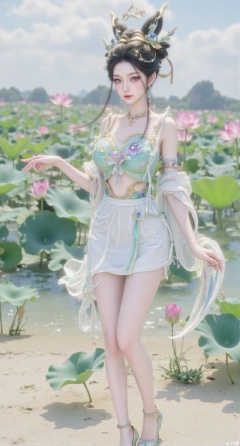 (masterpiece:1.2),best quality, (UE5.5,rendered with Unreal Engine 5,Unreal Engine 5,CG rendering), (masterpiece:1.2),,1girl,solo,standing,looking at viewer,(cowboy_shot:1.3),black hair,long hair,high heels,blurry background,depth of field,motion blur,short dress,china_dress,chinese_style,bare shouders,crystal_earrings,headpiece,hair_tie,chest_jewel,gem,necklace,jewelry,in summer,day,outdoors,nature,sea,(beach:1.4),(huge breasts:2.99),(full breasts:2.99),(lotus pond and pink lotus flowers:1.59),,(very long legs,Diamond-studded high heels:1.5),Xmupeiling,XsongyuYK,XqiyueFHK,XheguangzhefandiYK,XxiaobaiNZYK,XlimuwanJCBYK,XmeijiK,XzhouruK,XHhanfududou,XzhouruK2,XmeijiK2,XlinziyueK2,Xjinniang2,Xdunhuangfeitian,Xyinggou2,XnangongxierK2,Xnvwashenian2,XmupeilingYK,Xdaji2