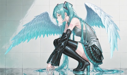 1girl, solo, long hair, breasts, skirt, shirt, hair ornament, thighhighs, bare shoulders, twintails, very long hair, full body, pleated skirt, boots, detached sleeves, wings, necktie, sleeveless, black thighhighs, miniskirt, black skirt, nail polish, black footwear, high heels, from side, aqua eyes, zettai ryouiki, sleeveless shirt, aqua hair, tattoo, profile, thigh boots, squatting, grey shirt, high heel boots, black sleeves, tiles, shoulder tattoo, aqua nails, aqua necktie, reflective floor, hatsune miku