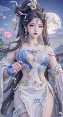 (masterpiece, best quality:1.2),1girl, navel, solo, midriff, bare shoulders, hair ornament,(long hair),(High double ponytail:1.49), red lips, BREAK, (looking at viewer:1.39), chinese clothes,(long dress:1.36), (lace:1.28), BREAK,blurry, solo focus, long hair, lips, daytime, lipstick, outdoors, standing,upper body,(huge breasts:2.99), (full breasts:2.99),background, solo, makeup,Xyunxiao,(Lotus,Water Lily,Blue sky,full moon:1.39),(Lotus pond,ancient Chinese architecture:1.39),Xmupeiling,XsongyuYK,XqiyueFHK,XheguangzhefandiYK,XxiaobaiNZYK,XlimuwanJCBYK,XmeijiK,XzhouruK,Xjinniang,Xliangpianqun,Xyinggou,Xfeitianwunv,XnangongxierK,Xbaiyuekuishouban,Xnvwashenian,XmupeilingY