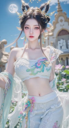 (masterpiece, best quality:1.2),1girl, navel, solo, midriff, bare shoulders, hair ornament,(long hair),(High double ponytail:1.49), red lips, BREAK, (looking at viewer:1.39), chinese clothes,(long dress:1.36), (lace:1.28), BREAK,blurry, solo focus, long hair, lips, daytime, lipstick, outdoors, standing,upper body,(huge breasts:2.99), (full breasts:2.99),background, solo, makeup,Xyunxiao,(Lotus,Water Lily,Blue sky,full moon:1.39),(Lotus pond,ancient Chinese architecture:1.39),Xmupeiling,XsongyuYK,XqiyueFHK,XheguangzhefandiYK,XxiaobaiNZYK,XlimuwanJCBYK,XmeijiK,XzhouruK,Xjinniang,Xliangpianqun,Xyinggou,Xfeitianwunv,XnangongxierK,Xbaiyuekuishouban,Xnvwashenian,XmupeilingY,Xdaji,Xyujishenian,XluxueqiX